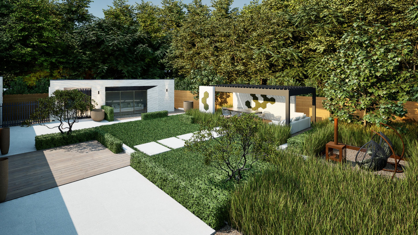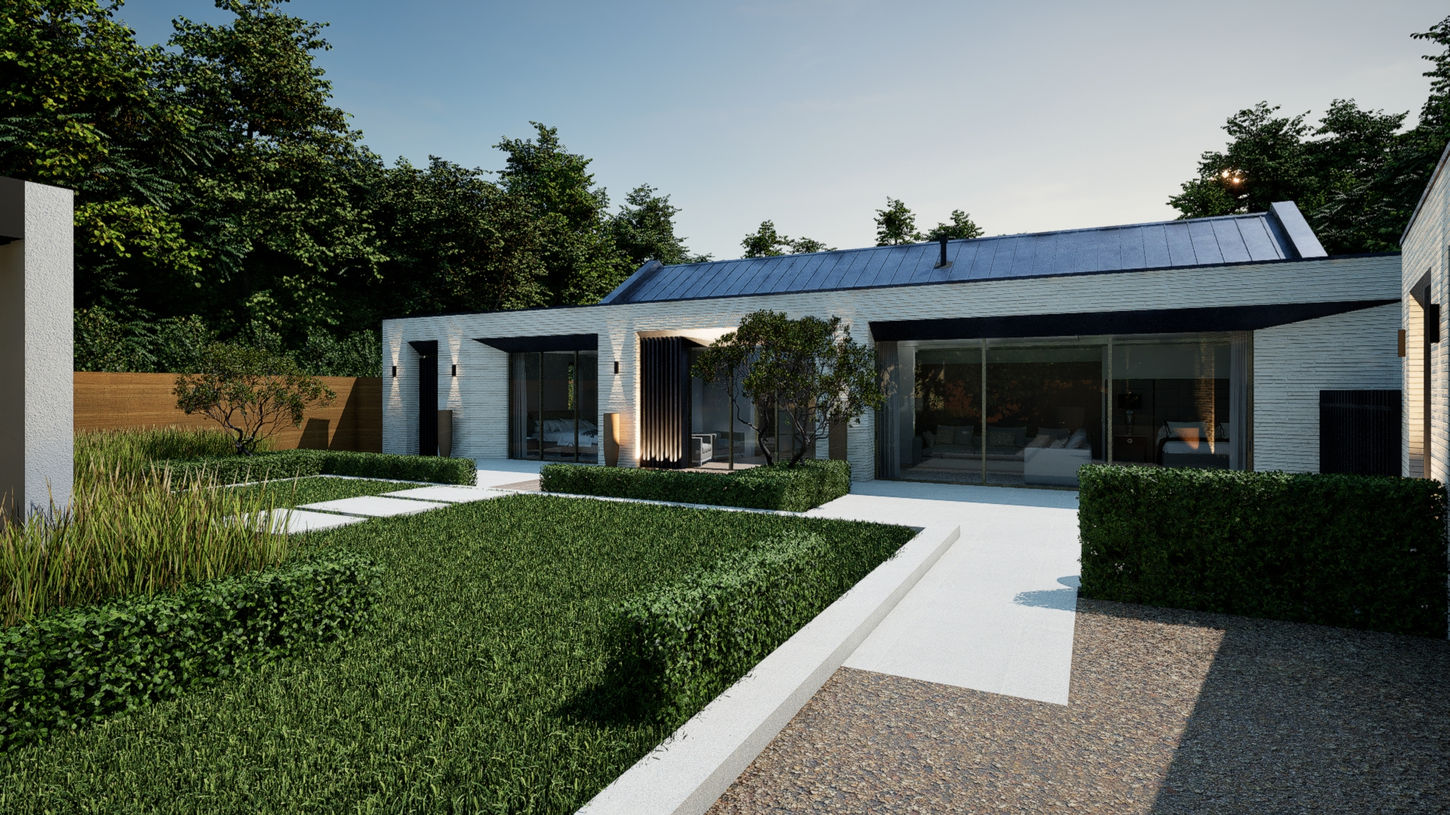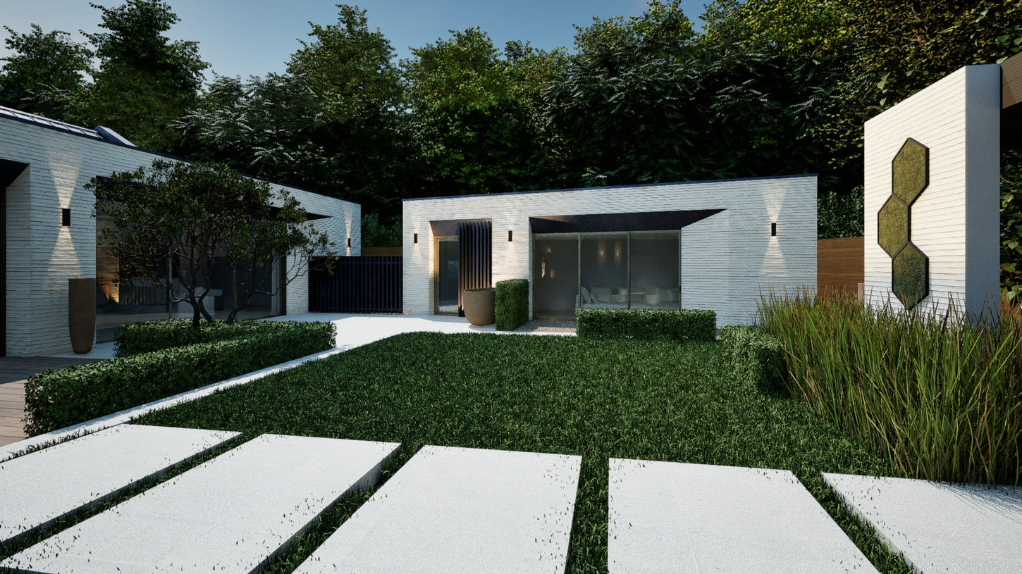 A sleek single-storey residence designed with modern living in mind. This project showcases a minimalist architectural approach, combining clean lines, soft-toned brick, and deep blue roofing to create a balanced and contemporary aesthetic. The private garden space features structured greenery and a bespoke outdoor pavilion — perfect for relaxation or entertaining. The seamless integration of indoor and outdoor zones offers both functionality and visual harmony.