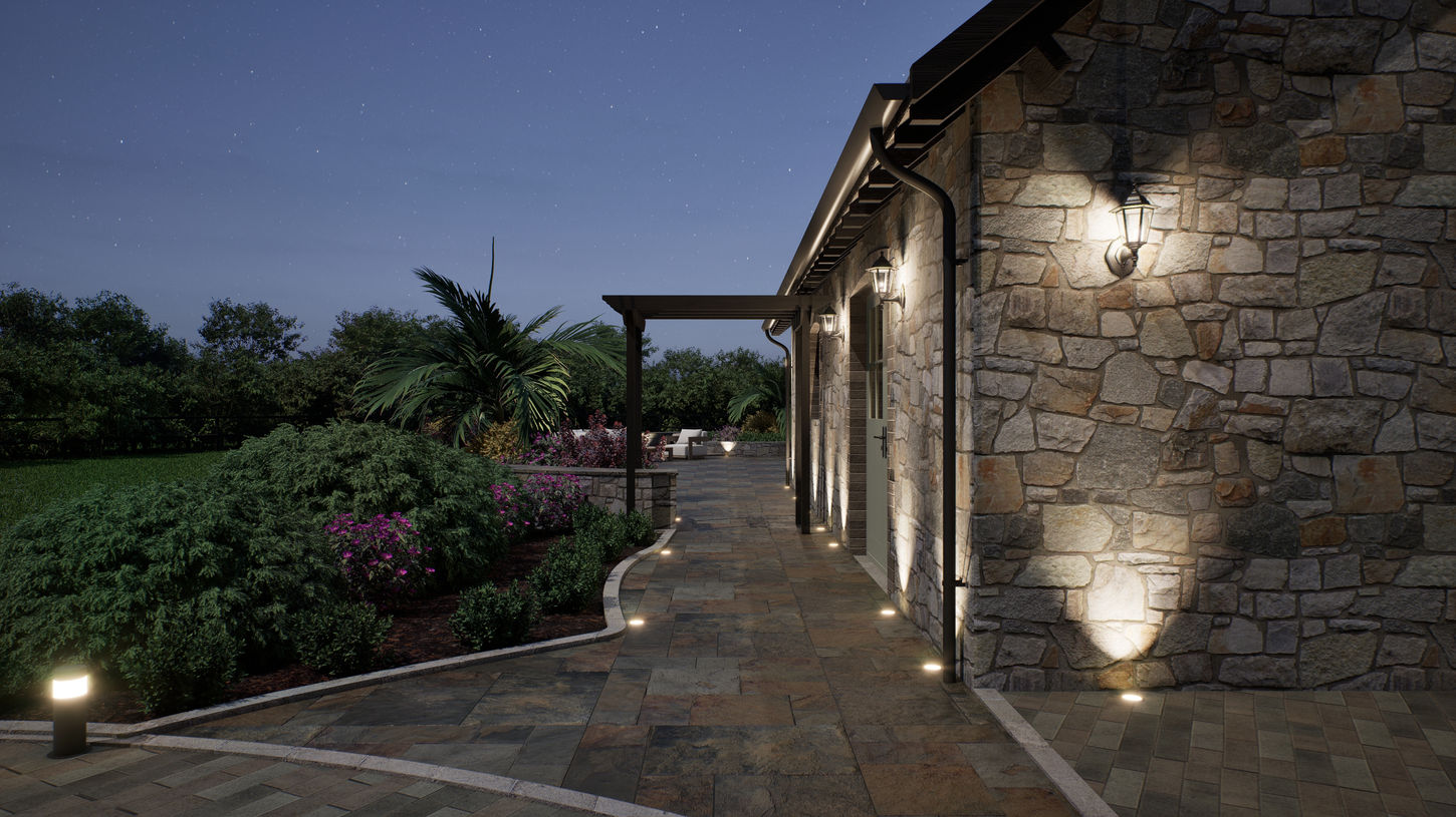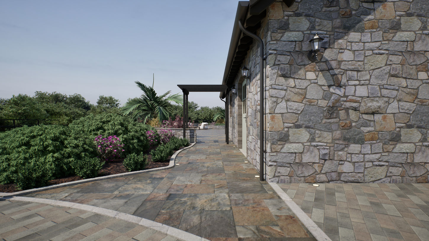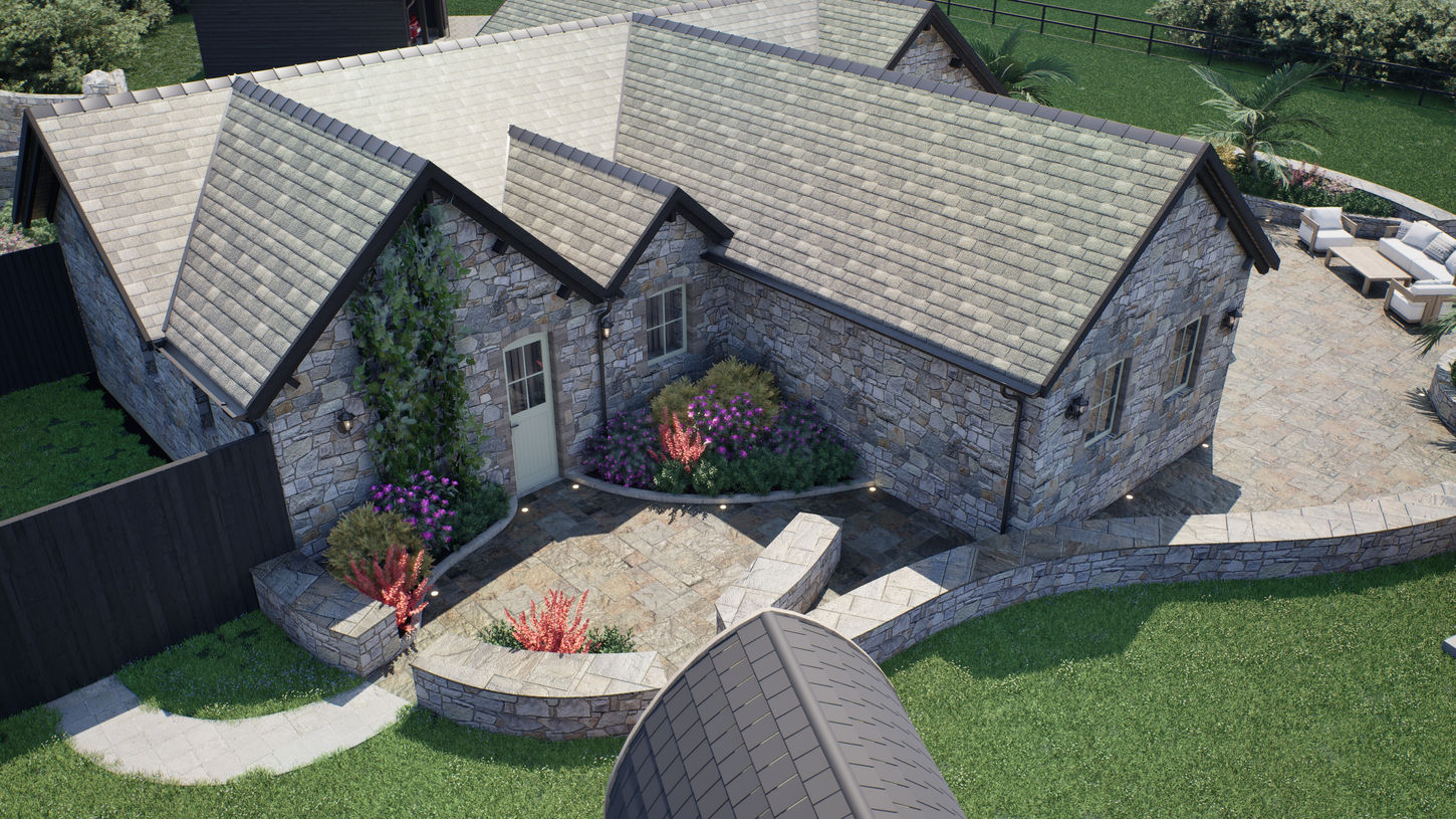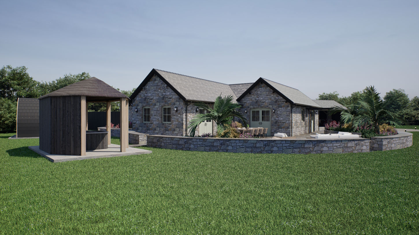 This private countryside residence in Mulbarry, UK, blends timeless character with refined architectural design. The exterior showcases traditional stone cladding paired with soft green doors and windows, creating a warm and inviting façade. Surrounded by lush landscaping and a spacious courtyard, the home includes a charming outdoor dining and lounge area — ideal for summer gatherings and peaceful moments in nature. The visualization highlights every detail, from the textures of the stone walls to the elegant lighting and paving patterns, capturing the rustic charm and comfort of rural British living.
